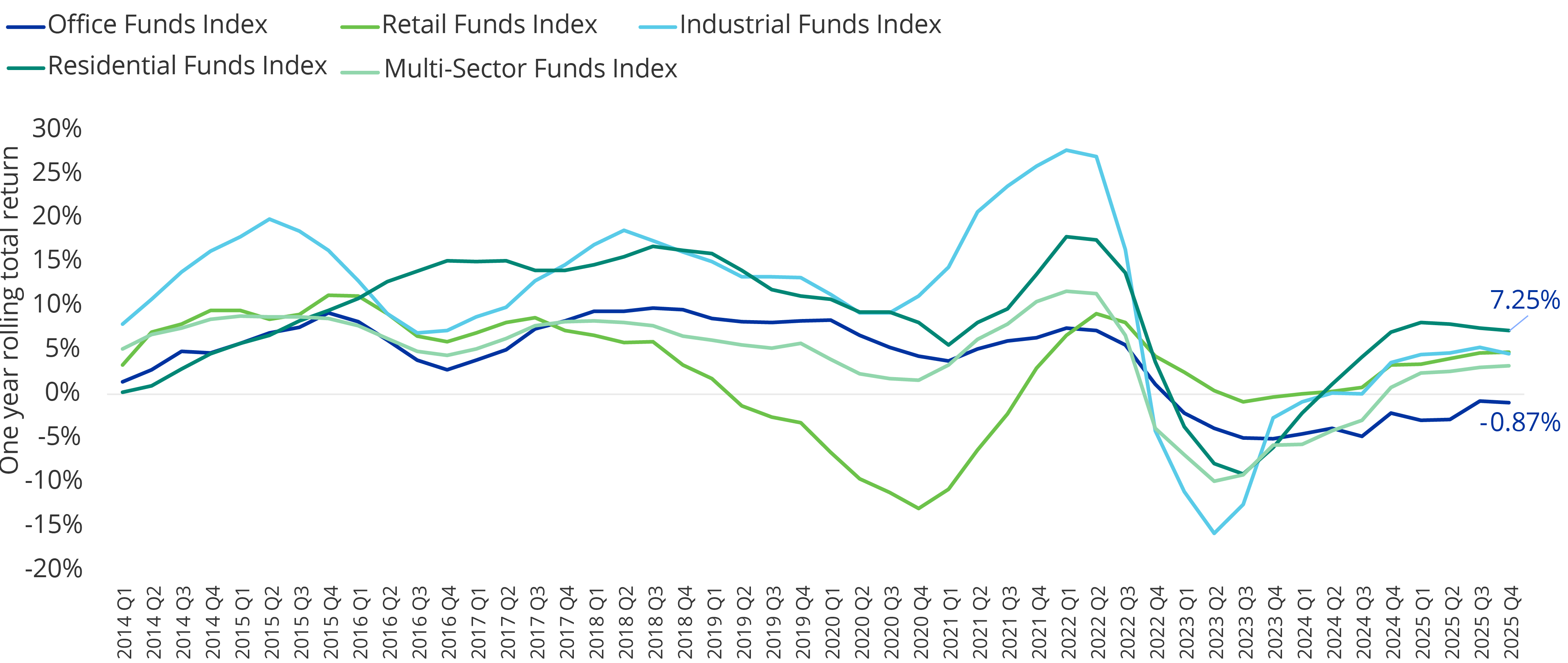 Residential funds outperformed all other single sector strategies throughout 2024 and 2025, reporting a one year rolling return of 7.25% in Q4 2025, in line with the 7.10% recorded in Q4 2024.