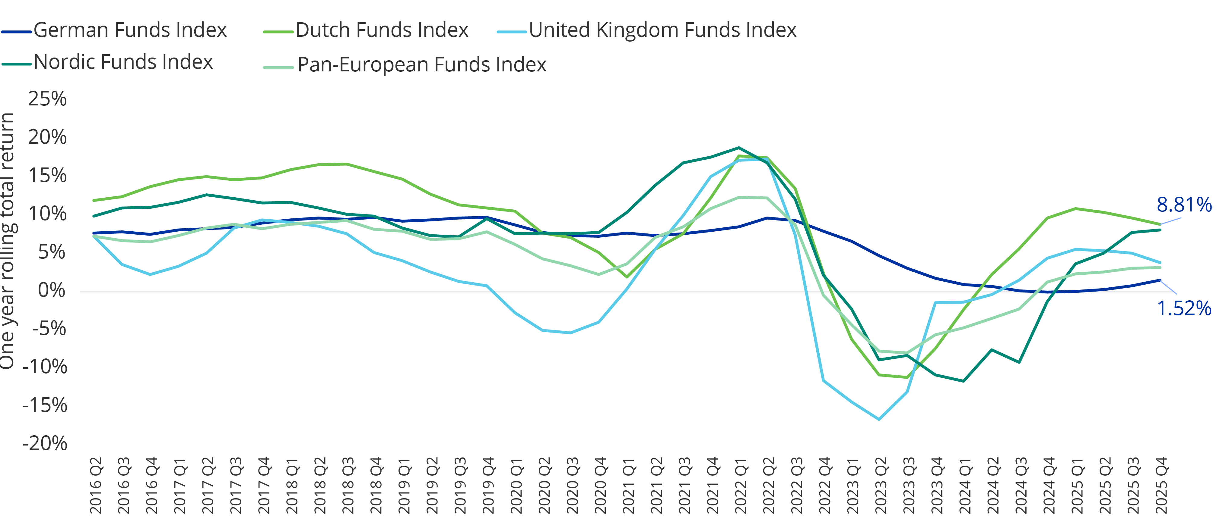 The Nordic funds outperformed all countries and regions for the first time since Q2 2021, with a quarterly total return of 3.19% in Q4 2025. Their one year rolling return is the third highest among the geographies and has increased significantly to 8.09% in Q4 2025, from -1.27% in Q4 2024.